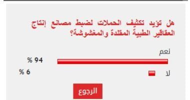 وأيد 94% من القراء مطالب تكثيف الحملات لضبط مصانع إنتاج العقاقير الطبية المقلدة والمغشوشة، بينما رفض 6% مطالب تكثيف الحملات لضبط مصانع إنتاج العقاقير الطبية المقلدة والمغشوشة.