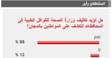 وأيد 88% من القراء مطالب تكثيف وزارة الصحة للقوافل الطبية فى المحافظات للكشف على المواطنين بالمجان؟، بينما رفض 12% مطالب تكثيف وزارة الصحة للقوافل الطبية فى المحافظات للكشف على المواطنين بالمجان.