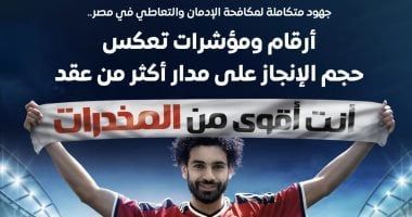 نشر المركز الإعلامي لمجلس الوزراء عددًا من الإنفوجرافات عبر منصاته على مواقع التواصل الاجتماعي، سلط من خلالها الضوء على جهود الدولة المتكاملة لمكافحة الإدمان والتعاطي في مصر، بالإضافة إلى حجم الإنجاز الذي تعكسه الأرقام والمؤشرات على مدار أكثر من عقد.
