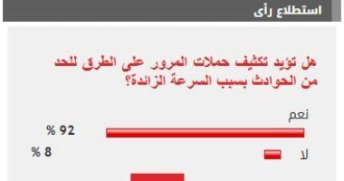 وأيد 92% من القراء مطالب تكثيف حملات المرور على الطرق للحد من الحوادث بسبب السرعة الزائدة، بينما رفض 8% مطالب تكثيف حملات المرور على الطرق للحد من الحوادث بسبب السرعة الزائدة.
