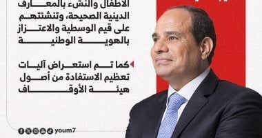 وأكد الرئيس السيسى، في هذا الإطار، على ضرورة تزويد الأطفال والنشء بالمعارف الدينية الصحيحة، وتنشئتهم على قيم الوسطية والاعتزاز بالهوية الوطنية.