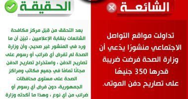وتبين بعد التحقق من قِبَل مركز مكافحة الشائعات بنقابة الإعلاميين، أن ما ورد في المنشور غير صحيح، وأن وزارة الصحة لم تفرض أي ضرائب أو رسوم على تصاريح الدفن، واستخراج تصاريح الدفن مجانًا تمامًا في جميع مكاتب ومراكز الصحة على مستوى محافظات الجمهورية، دون فرض أي رسوم أو ضرائب من أي نوع ، وهذا ما أكدته وزارة الصحة والسكان.