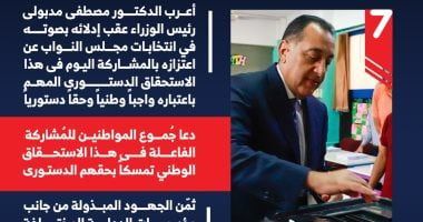 وعقب الإدلاء بصوته، أعرب الدكتور مصطفى مدبولي عن اعتزازه بالمشاركة اليوم في هذا الاستحقاق الدستوري المهم، باعتباره واجباً وطنياً وحقاً دستورياً، داعياً جُموع المواطنين للمُشاركة الفاعلة في هذا الاستحقاق الوطني، تمسكاً بحقهم الدستوري، ولمواصلة دورهم في المُساهمة الايجابية تجاه بناء مؤسسات الوطن، ودعم مسيرته لتحقيق التنمية المنشودة، خاصة بعد ما شهده التصويت في الخارج بالمرحلة الأولى من إقبال كبير لأبناء مصر.