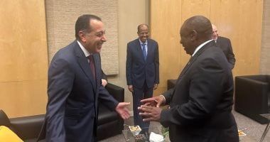 ولدى وصول رئيس مجلس الوزراء إلى مقر انعقاد عشاء العمل بمركز ساندتون للمؤتمرات بقلب مدينة جوهانسبرج، التقى الرئيس سيريل رامافوزا، حيث نقل الدكتور مصطفى مدبولي، تحيات السيد الرئيس عبدالفتاح السيسي، رئيس الجمهورية، إلى أخيه رئيس جمهورية جنوب أفريقيا، مُعربًا عن تقدير مصر للرئاسة الجنوب أفريقية لمجموعة العشرين وعلى توجيه الدعوة لها للمشاركة، كدولة ضيف، في اجتماعات المجموعة لهذا العام.