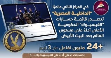 السبت، 22 نوفمبر 2025 08:52 ماحتلت الصفحة الرسمية لوزارة الداخلية المصرية على الفيسبوك المركز الثاني على مستوى العالم للحسابات الحكومية الأعلى أداءًا بعد صفحة البيت الأبيض.