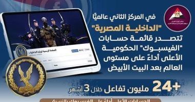السبت، 22 نوفمبر 2025 09:48 منشر مركز المعلومات ودعم اتخاذ القرار بمجلس الوزراء إنفوجرافًا جديدًا استعرض خلاله النتائج الصادرة عن تقرير دولي لمؤسسة Emplifi العالمية، والذي صنّف الصفحة الرسمية لوزارة الداخلية المصرية في المركز الثاني عالميًا بين أعلى الصفحات الحكومية أداءً على منصة "فيسبوك" خلال الربع الثالث من عام 2025، وذلك مباشرة بعد الصفحة الرسمية للبيت الأبيض.