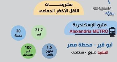 يعد مترو الإسكندرية إنجازا وتغييرا حقيقيا لمشروعات النقل داخل المحافظة، حيث يجرى تنفيذ المرحلة الأولى للمشروع من أبو قير لمحطة مصر، وفى النقاط التالية أهم المعلومات عن المشروع.