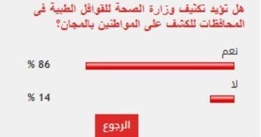وأيد 86% من القراء تكثيف وزارة الصحة للقوافل الطبية فى المحافظات للكشف على المواطنين بالمجان، بينما رفض 14% مطالب تكثيف وزارة الصحة للقوافل الطبية فى المحافظات للكشف على المواطنين بالمجان.