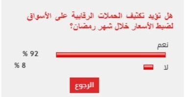 وأيد 92% من القراء مطالب تكثيف الحملات الرقابية على الأسواق لضبط الأسعار خلال شهر رمضان، بينما عارض 8% من القراء مطالب تكثيف الحملات الرقابية على الأسواق لضبط الأسعار خلال شهر رمضان.