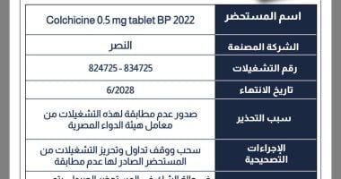 أعلنت هيئة الدواء المصرية عن إصدار منشور تحذيري بسحب ووقف تداول عدد من تشغيلات مستحضر أقراص كولشيسين 0.5 ملغ، وذلك بعد ثبوت عدم مطابقتها للمواصفات القياسية من خلال تحاليل معامل الهيئة.