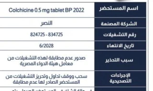 أعلنت هيئة الدواء المصرية عن إصدار منشور تحذيري بسحب ووقف تداول عدد من تشغيلات مستحضر أقراص كولشيسين 0.5 ملغ، وذلك بعد ثبوت عدم مطابقتها للمواصفات القياسية من خلال تحاليل معامل الهيئة.